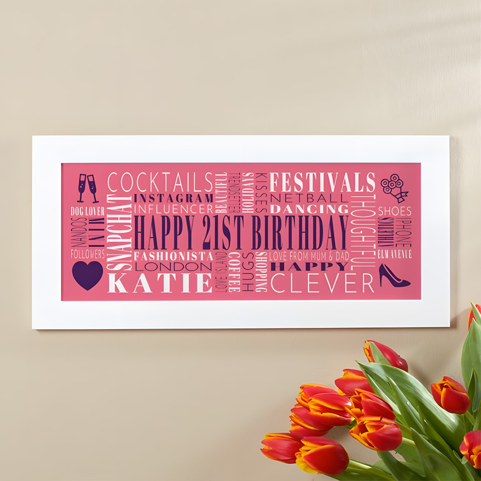 To commemorate a special milestone landmark 21st birthday, why not try creating something out of the ordinary for the young lady who has everything by making a personalised word picture Read more… featuring all her favorite memories as a thoughtful birthday gift? Our personalised word art for walls makes a great 21st birthday gift for a daughter, sister, granddaughter, niece, bestie or work colleague. All you need to do to create a special 21st birthday gift of personalised word picture print or canvas is to think up your unique memories & words that are special to her (that’s the difficult bit), then type them on our unique word art templates, next select your icons (from a huge range of 150), next choose from a wide range of colour options & finally select the size and if you want your personalised gift as a framed print, canvas, deep sided box frame or an unframed print on 240gsm paper. If that sounds complicated, believe us – it really isn’t, and your custom gift of a word art picture is created on screen for you to view in seconds. Once you checkout, we dispatch orders in just 2 working days free of charge. Start creating your bespoke 21st birthday gift of a personalised word art picture today …Read less
