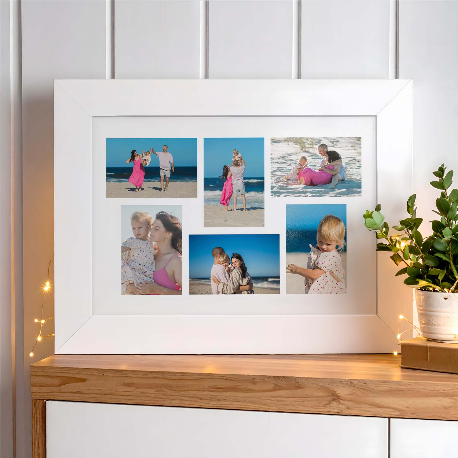 Turn your favourite memories into a stunning piece of wall art with our custom landscape 6 photo collage frame. Designed to showcase a balanced mix of three landscape and three portrait images, this Read more… personalised photo print offers a modern and visually striking way to display your most meaningful moments in one beautifully arranged layout. Whether you’re celebrating a milestone birthday, anniversary, wedding, holiday, or simply capturing everyday memories, this custom 6 photo collage provides a unique and heartfelt way to bring your photos to life. The carefully structured layout ensures that each image stands out while working harmoniously together to create a cohesive and professional-looking design. One of the standout features of this personalised photo collage is how easy it is to create. Our intuitive online design tool allows you to upload your six chosen photos quickly and effortlessly. Within moments, you can arrange your images into the pre-designed layout and instantly see exactly how your finished collage will look. This live preview feature gives you complete confidence before purchasing, ensuring that every detail is just right. You can make adjustments in real time, swap images, and perfect your design until it meets your expectations. Unlike many generic photo collage products, this landscape format has been specifically designed to balance both portrait and landscape images. This makes it ideal for a wide variety of photos, from scenic holiday shots and family portraits to candid moments and special occasions. The structured layout ensures that your images are displayed clearly without overcrowding, maintaining a clean and elegant appearance that suits any home décor. Quality is at the heart of everything we produce. Your custom 6 photo collage is printed using high-resolution printing technology on premium materials to ensure sharp detail, vibrant colours, and long-lasting durability. Every image is carefully reproduced to maintain clarity and depth, ensuring your memories look just as beautiful in print as they do on screen. You can choose from a range of high-quality finishes to suit your space and style. Our framed options provide a sleek and ready-to-hang solution, available in classic black or white frames that complement any interior. For a more contemporary feel, canvas prints offer a textured, gallery-style finish, while unframed prints provide flexibility for those who prefer to mount or frame the artwork themselves. This personalised photo collage also makes an exceptional gift. Whether you are looking for a thoughtful birthday present, a sentimental anniversary gift, or a meaningful keepsake for a loved one, a custom multi photo print is always a memorable choice. By combining six carefully selected images, you can tell a story, celebrate a journey, or highlight special relationships in a way that feels truly personal. The landscape orientation of this collage makes it perfect for displaying above sofas, beds, desks, or shelves. Its horizontal layout naturally draws the eye and creates a focal point in any room, making it ideal for living rooms, bedrooms, hallways, or even office spaces. The clean white mount-style background enhances each image, allowing your photos to stand out without distraction. We understand that when creating something personal, speed and reliability matter. That’s why we offer fast, free delivery and quick dispatch, ensuring your custom photo collage arrives promptly and in perfect condition. Each product is carefully packaged to protect it during transit, so it reaches you ready to display or gift. This 6 image photo collage is more than just a print; it’s a way to preserve memories, celebrate special moments, and create meaningful wall art that you can enjoy every day. With its combination of thoughtful design, ease of use, and premium quality, it stands out as one of the best personalised photo collage options available. If you’re looking for a custom landscape photo collage that is simple to create, visually stunning, and made to last, this is the perfect choice. Upload your photos, preview your design instantly, and transform your memories into a timeless piece of personalised wall art.