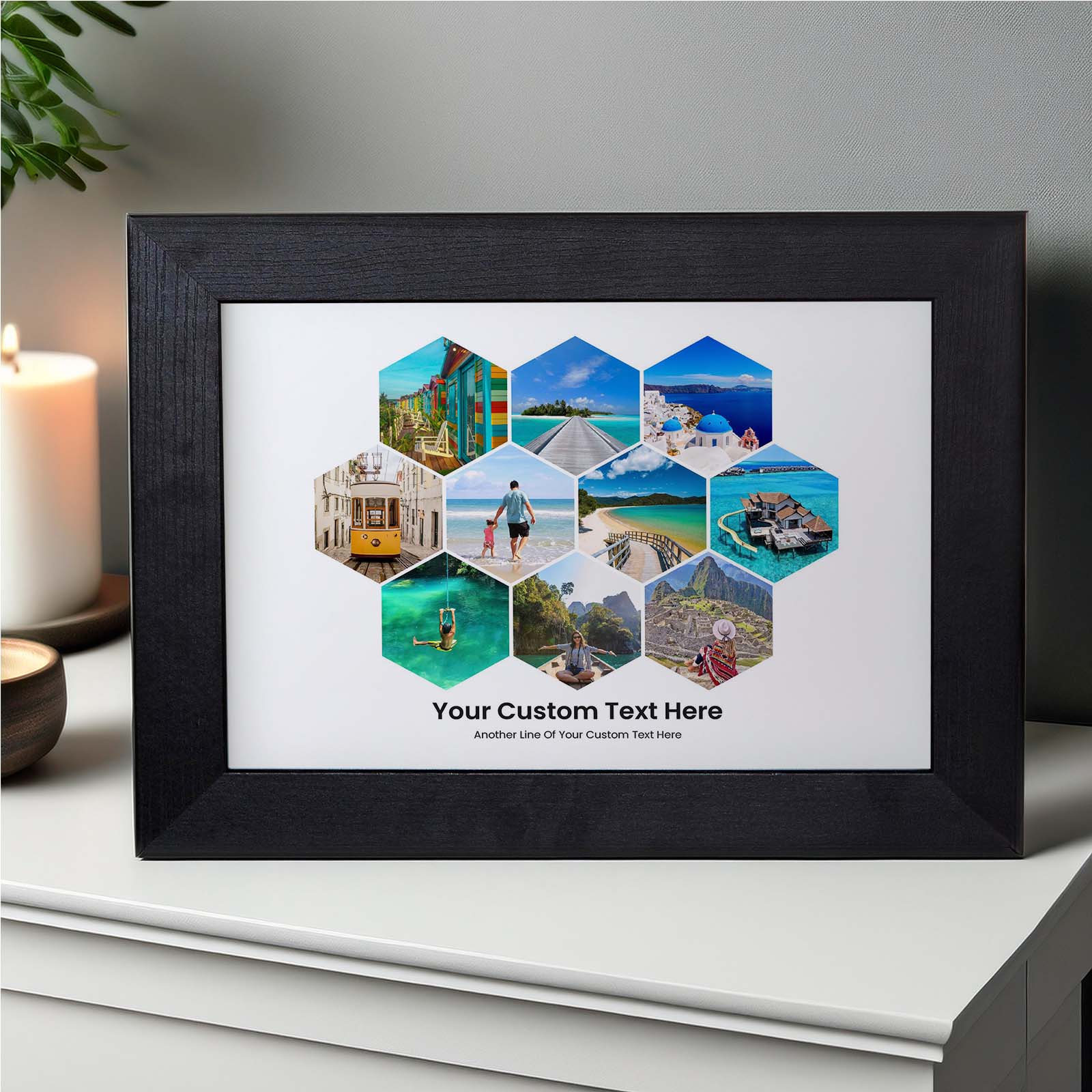Custom Hexagonal Photo Collage Print with Personalised Text – A Modern Gift Full of Memories Celebrate your favourite moments in style with our Custom Hexagonal Read more… Photo Collage Print, featuring 10 of your photos in a sleek geometric design and two lines of personalised text to make it truly your own. This unique piece of wall art transforms your memories into a stunning, contemporary photo montage — the perfect balance of modern design and heartfelt emotion. Whether you’re looking for a thoughtful birthday gift, a romantic anniversary present, or a meaningful keepsake for your home, this custom print captures life’s most precious moments beautifully. Available as a framed print (in black or white), premium canvas, or unframed paper print, this landscape-format design makes a timeless statement in any room. With our live on-screen preview technology, you can see your custom creation before you buy — ensuring every detail is exactly how you imagined it. A Picture-Perfect Gift Designed from the Heart In a world of generic gifts, this personalised photo collage print stands out as something truly meaningful. Each of the ten hexagonal photos forms part of a striking, balanced composition — your story told through your favourite moments. Every snapshot, smile, and memory combines to create a visually stunning mosaic that’s both contemporary and deeply personal. Add two lines of text — perhaps a name and special date, a short message, or a meaningful quote — to give your design an extra emotional touch. This is more than wall art; it’s a gift full of love, laughter, and life. Whether you’re marking a milestone anniversary, celebrating family memories, or surprising a loved one “just because,” this photo collage brings emotion and artistry together in one perfect keepsake. High-Quality Craftsmanship for Lasting Beauty Every custom hexagonal photo print is crafted using the highest-quality materials and printing techniques to ensure your memories are preserved in vivid detail. We use professional-grade printers, archival-quality inks, and premium paper or canvas to produce a flawless finish that’s rich in colour, crisp in detail, and made to last a lifetime. Choose your preferred format: Framed Prints (Black or White): Elegant, ready-to-hang options that give your collage a polished gallery look. Canvas Prints: Printed on thick, artist-grade canvas with fade-resistant inks for rich texture and durability. Unframed Prints: Perfect for those who prefer to choose their own frame or display style. Every print is produced by our expert UK team and quality-checked by hand, ensuring a professional finish every single time. Contemporary Design That Fits Any Space The hexagonal layout gives this design a stylish and contemporary edge, perfect for modern homes and offices alike. The geometric pattern creates a sense of flow and symmetry, making it visually striking while allowing each photo to shine individually. This landscape format works beautifully above a sofa, bed, or mantelpiece — or as part of a feature wall surrounded by your other favourite prints. With a choice of background colours, frame options, and sizes, your personalised photo print can be tailored perfectly to your space and style. Personalised Text for a Meaningful Touch Your story deserves to be told in your own words. That’s why this design includes two lines of custom text, placed beneath or alongside your hexagonal photo layout for balance and clarity. Use your text to: Add a name and special date (e.g., “Sarah & Tom – Est. 2015”) Include a meaningful quote or lyric Write a personal message such as “Forever in our hearts” or “Memories we’ll treasure forever” It’s the perfect way to add emotional depth and personal significance to your print — transforming it from a collage of images into a timeless story of love, family, or friendship. The Perfect Gift for Any Occasion Looking for something different to give? This custom photo picture print makes the ideal gift for so many occasions — because it’s not just about the design, it’s about the memories behind it. Perfect for:Anniversaries: Celebrate your journey together with photos and words of love. Birthdays: Surprise a loved one with a gift full of shared memories. Weddings: A beautiful way to commemorate the big day. Mother’s or Father’s Day: A heartfelt reminder of family moments. Graduations or New Homes: Capture new beginnings in style. Memorials: Honour a life beautifully remembered. Whatever the occasion, this one-of-a-kind print makes an unforgettable impression. It’s personal, emotional, and created with care. See Your Design Before You Buy – Live Preview Technology Creating your personalised print couldn’t be easier — and thanks to our live on-screen preview system, you’ll see exactly how your artwork looks before you order. In just a few clicks, you can: Upload your 10 favourite photos from your device. Add your two lines of custom text — perhaps a message, names, or a special date. Watch your unique collage appear instantly on screen.Adjust, preview, and perfect your design before checkout. There’s no need to guess what the finished product will look like. What you see is exactly what you’ll receive — a beautifully printed, high-quality design made with precision and love. Fast, Free UK Delivery – Ready in Just Two Working Days We know how important it is to receive your gift quickly, especially for last-minute occasions. That’s why we offer fast, free UK delivery on all orders, and we aim to ship within two working days. Your print is carefully packaged to arrive in perfect condition, ready to hang, display, or gift straight away. We take care of every detail — so you can relax knowing your thoughtful, personal gift is on its way. Why Customers Love Our Custom Prints With over 12,000 five-star reviews on Trustpilot, our customers trust us to deliver beautiful, meaningful, and p